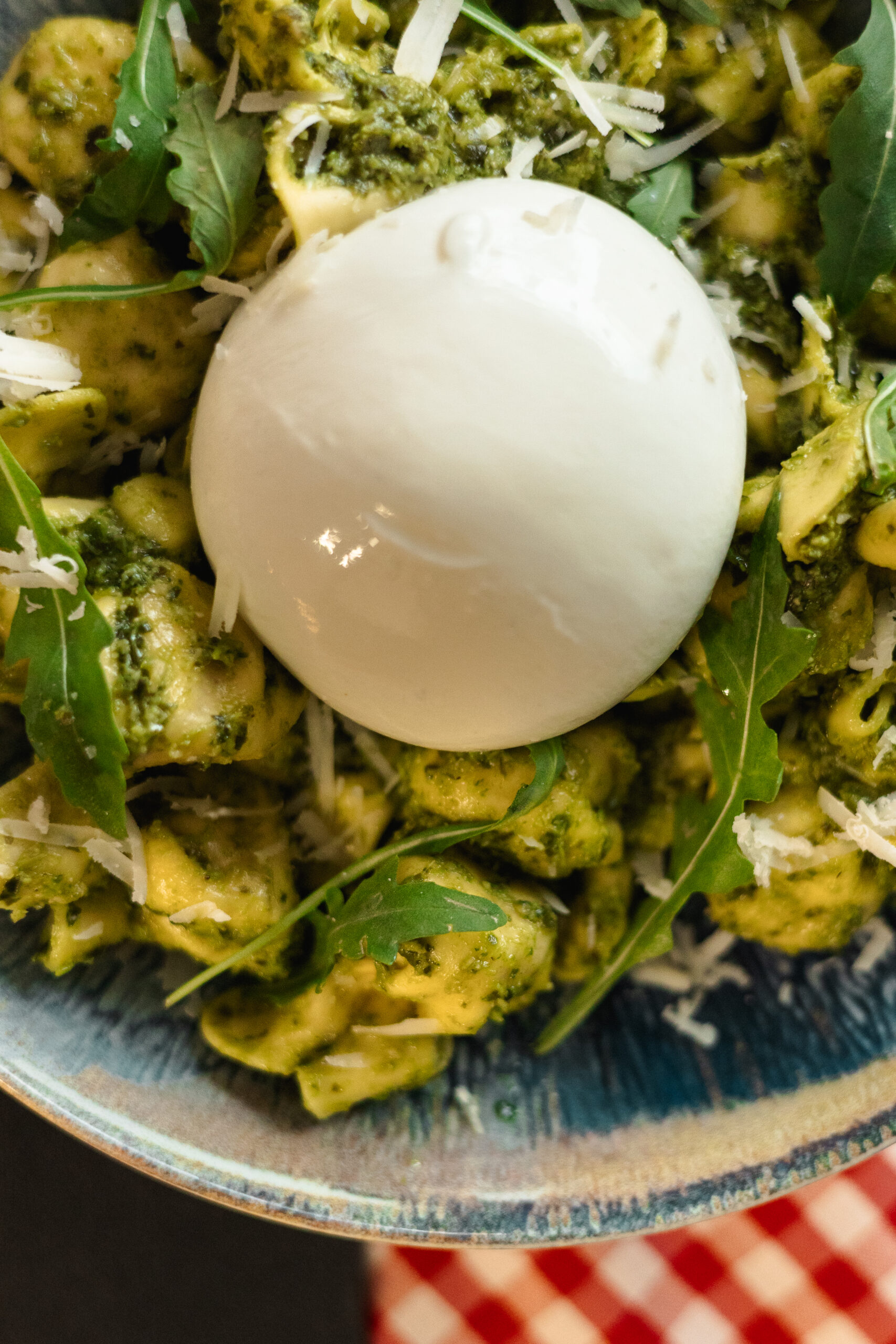 Mozzarella, mortadel·la, burrata, crema de festuc i granet de festuc.